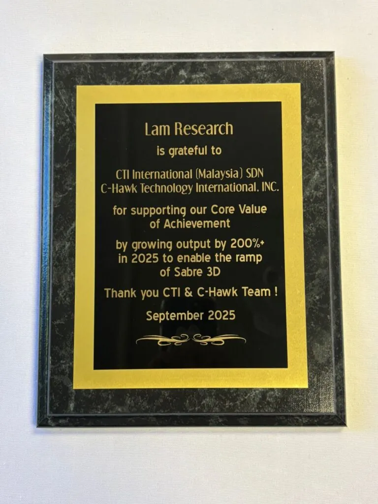 On September 8th, 2025, Peter Holland, Supply Chain Corporate VP at Lam Research, presented C-Hawk Technology with an award for supporting Lam’s core value of achievement by growing output by 200% in 2025 to enable the ramp of Sabre 3D.
